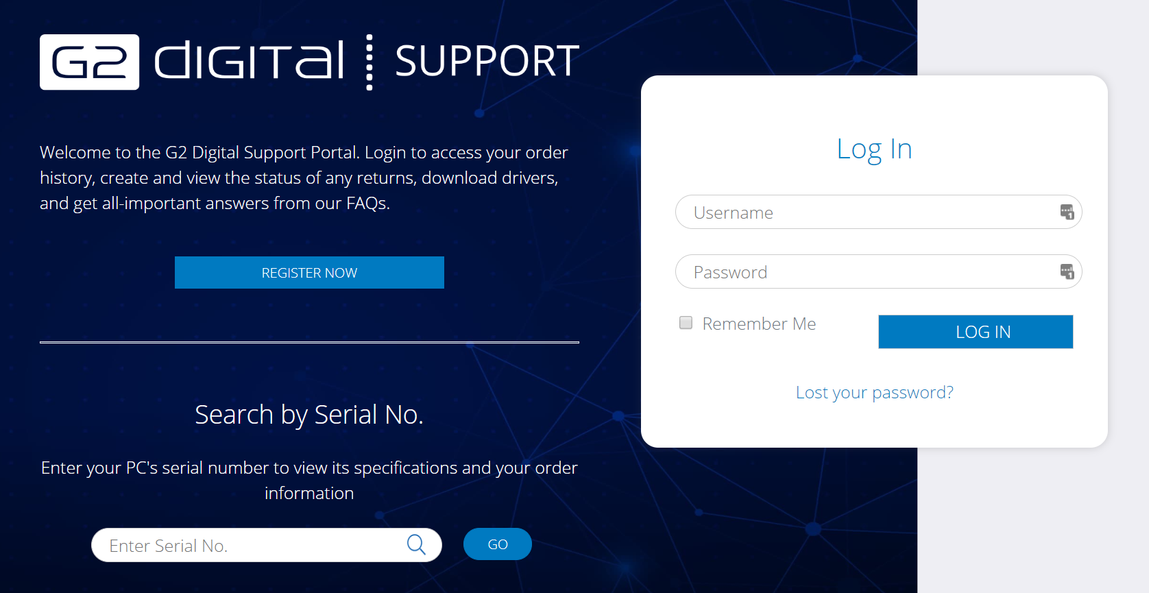 Wenn Sie sich nicht registrieren möchten, weil Sie entweder nur eine kleine Bestellung aufgegeben haben oder kein vollständiges Konto benötigen, können Sie die Details Ihrer Bestellung trotzdem über das Portal einsehen. Sie müssen lediglich die Seriennummer Ihres G2 Digital-Computers eingeben und erhalten dann einen eingeschränkten Zugang.